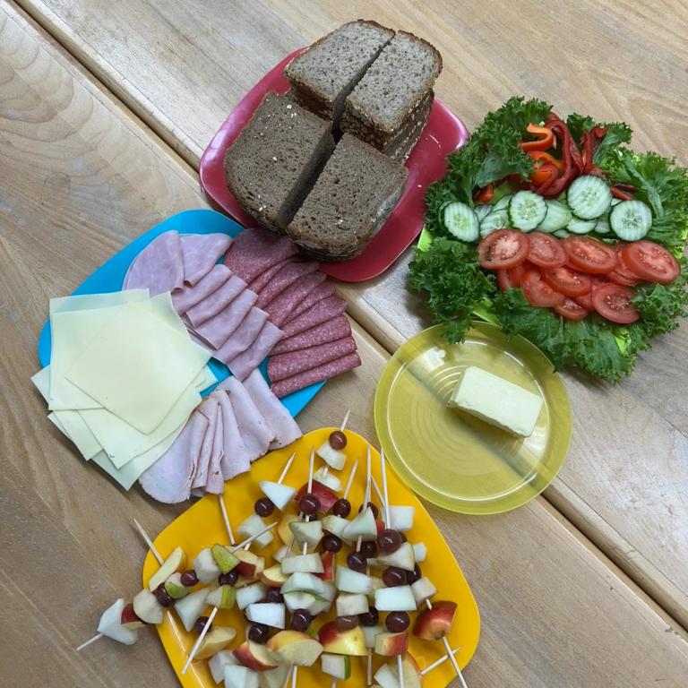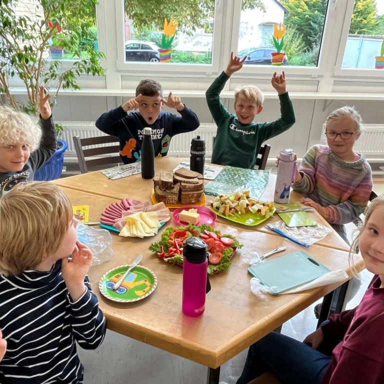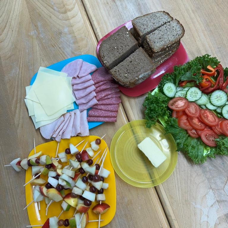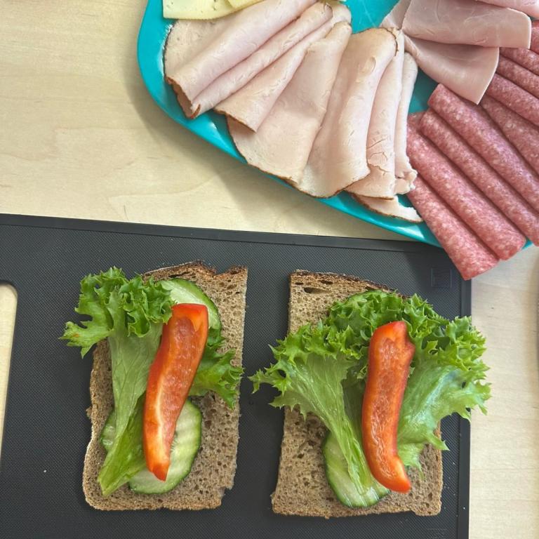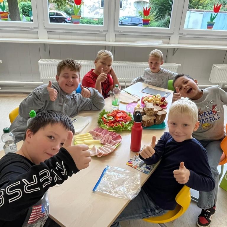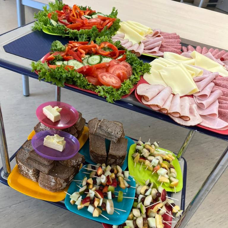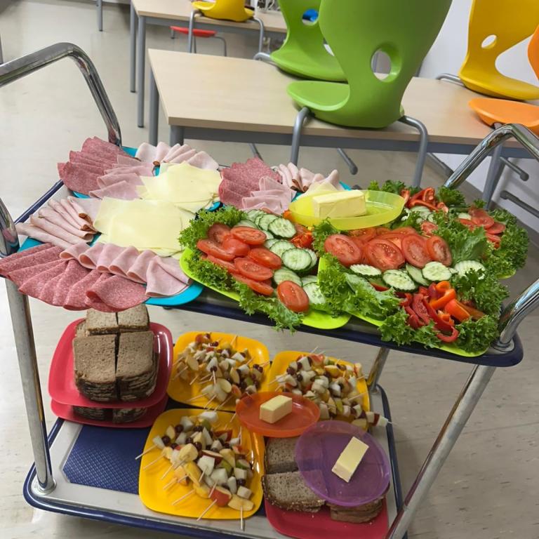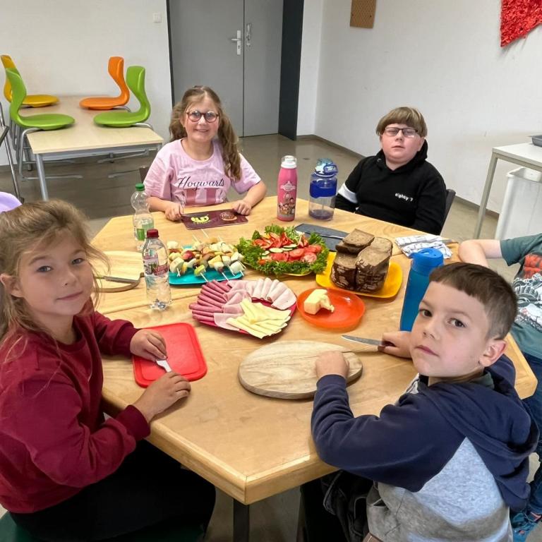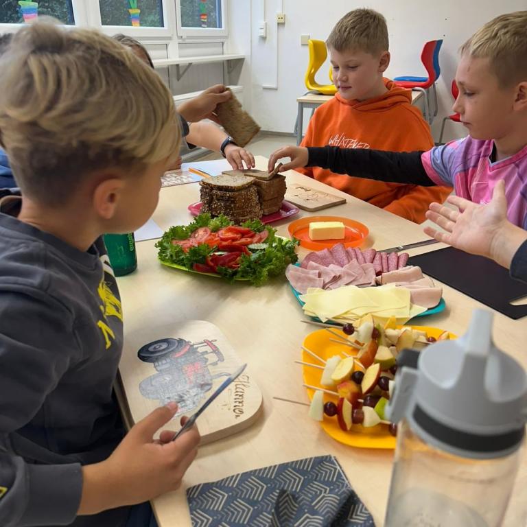 Anschließend wurde es praktisch: Die Kinder konnten sich ihre eigenen Brote belegen – mit Käse, Wurst und viel frischem Gemüse wie Paprika, Gurken und Tomaten. Dabei hatten alle viel Spaß und konnten gleichzeitig erleben, wie lecker ein gesundes Frühstück schmecken kann.