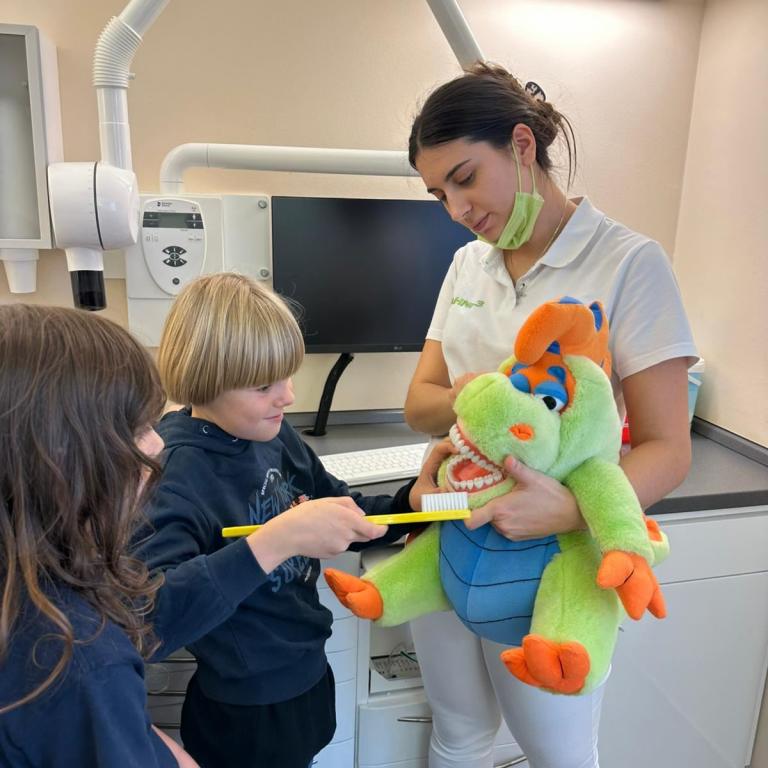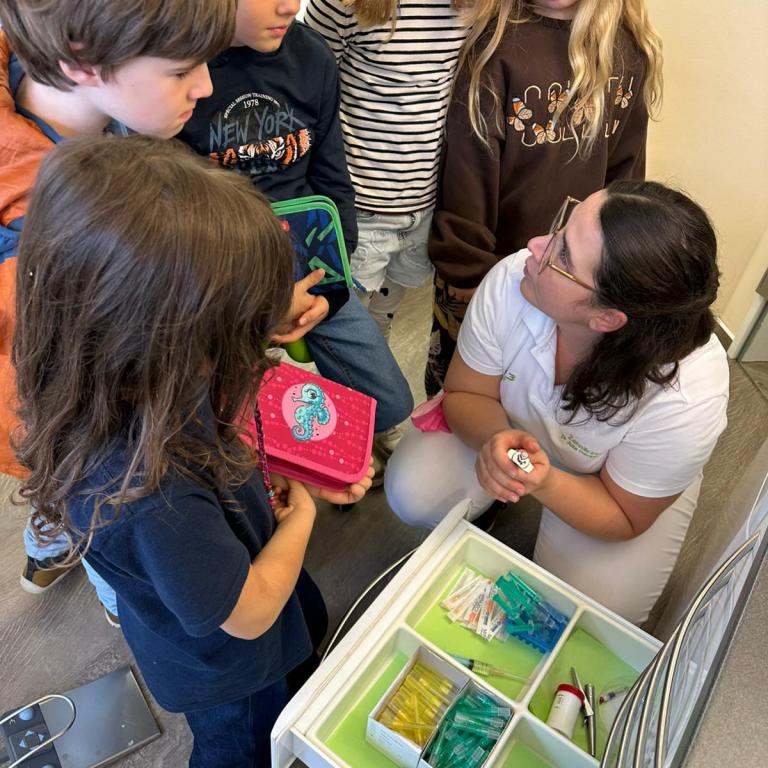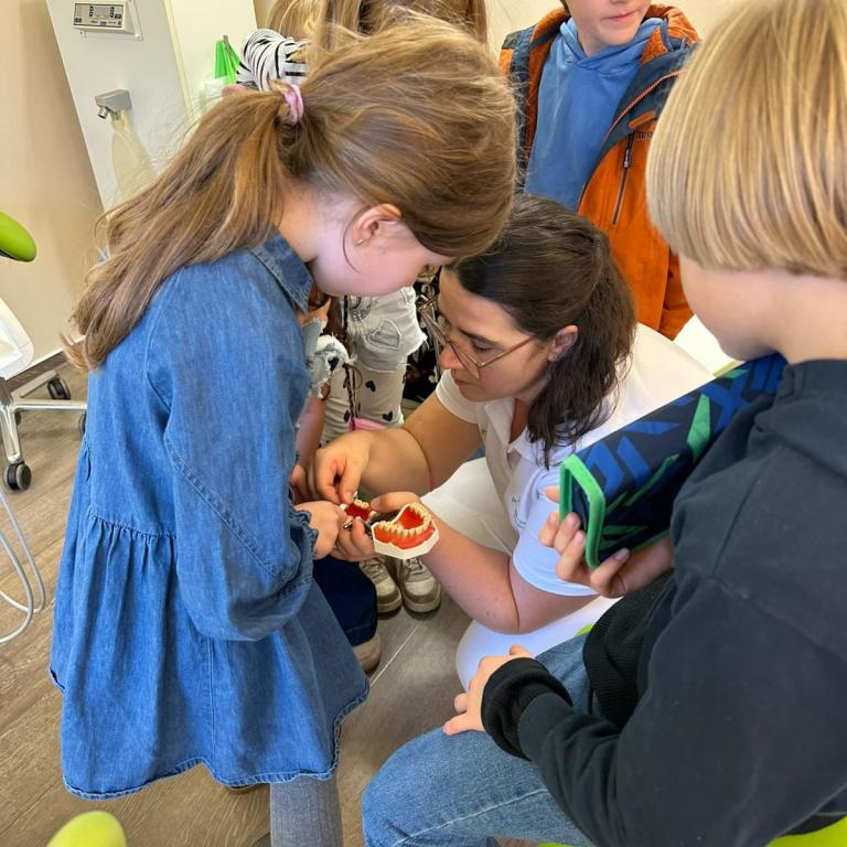 Mit viel Vorfreude und Neugier – und natürlich einigen spannenden Fragen im Gepäck – machten sich die Klasse schließlich auf den Weg zur Praxis. Vor Ort erklärte das Team von „Zahn Hoch 3“, wie und warum ein Zahn versiegelt wird und zeigte anschaulich, wie die Versiegelung funktioniert. An einem großen Gebissmodell wurde außerdem noch einmal die KAI-Methode zum Zähneputzen demonstriert.
