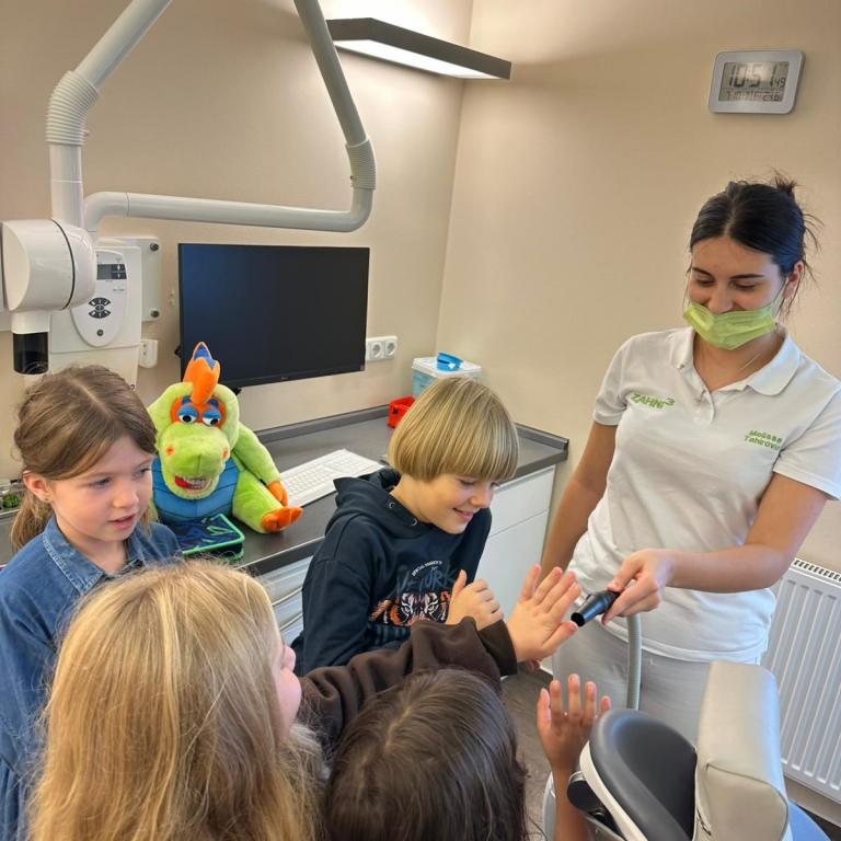 Am 07.10.2025 besucht4 die Klasse 2 die Zahnarztpraxis „Zahn Hoch 3“ in Boffzen. Schon im Vorfeld hatten sich die Kinder im Sachunterricht intensiv mit dem Thema „Zähne“ beschäftigt. Sie lernten die verschiedenen Zahnarten kennen, erfuhren, wie der Zahnwechsel abläuft, und übten die KAI-Methode für das richtige Zähneputzen. Auch das Thema zahngesunde Ernährung kam dabei nicht zu kurz.