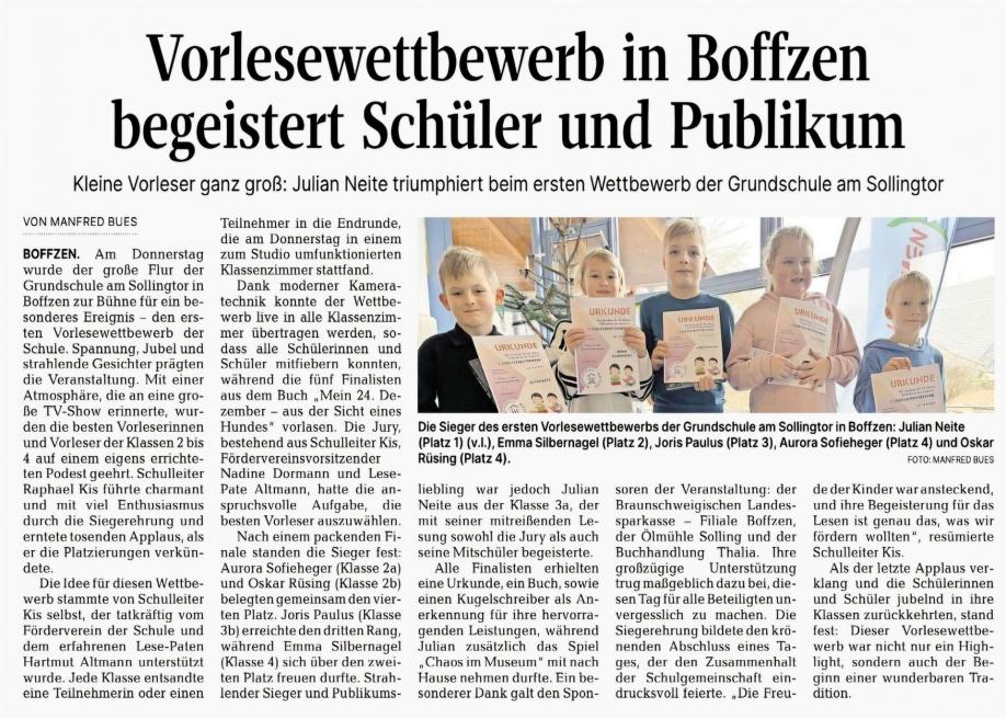 Am 14.03.2024 machte sich die Schule auf den Weg durch ganz Boffzen, um den herumliegenden Müll einzusammeln. Los ging es nach der ersten großen Pause. Nachdem die Ärmel hochgekrempelt, Einmalhandschuhe über die Hände gezogen sowie Müllbeutel, Eimer und Greifzangen genommen wurden, machten sich die Kinder an die Arbeit. Es ging von der Schule in Richtung Weser. Von dort aus lief eine Gruppe in Richtung Höxter bis zum „Schuhbaum“. Hier entdeckten die Kinder ein wahrscheinlich durch Hochwasser angespültes Fahrrad. Die andere Gruppe ging in Richtung Fürstenberg bis zur Kennedy-Brücke. Durch diesen Unterrichtsgang wurden die Kinder dafür sensibilisiert, die Umwelt durch die Vermeidung von Müll zu schützen.