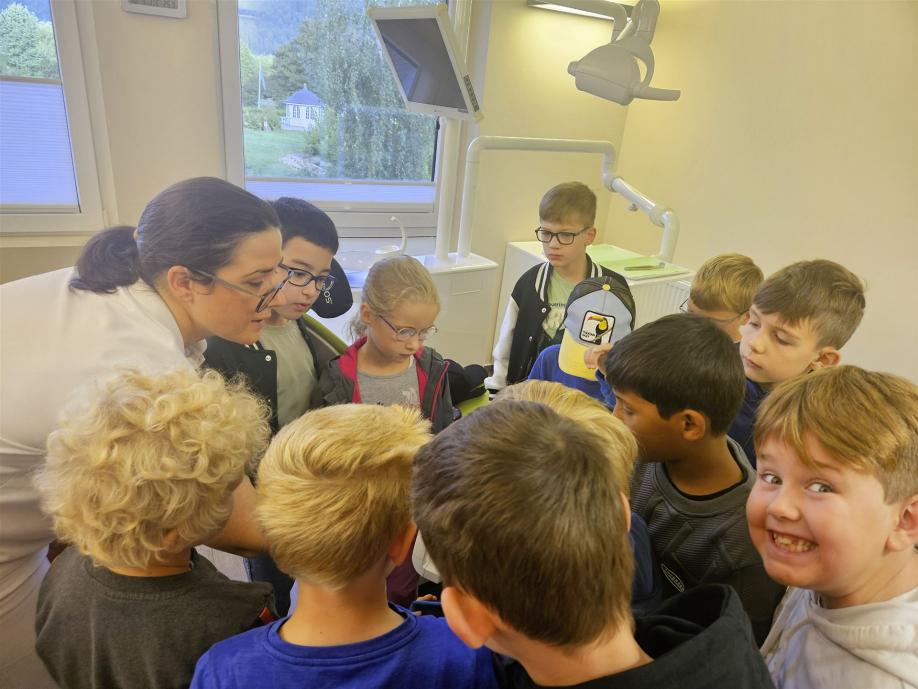 Am 07.10.2025 besucht4 die Klasse 2 die Zahnarztpraxis „Zahn Hoch 3“ in Boffzen. Schon im Vorfeld hatten sich die Kinder im Sachunterricht intensiv mit dem Thema „Zähne“ beschäftigt. Sie lernten die verschiedenen Zahnarten kennen, erfuhren, wie der Zahnwechsel abläuft, und übten die KAI-Methode für das richtige Zähneputzen. Auch das Thema zahngesunde Ernährung kam dabei nicht zu kurz.