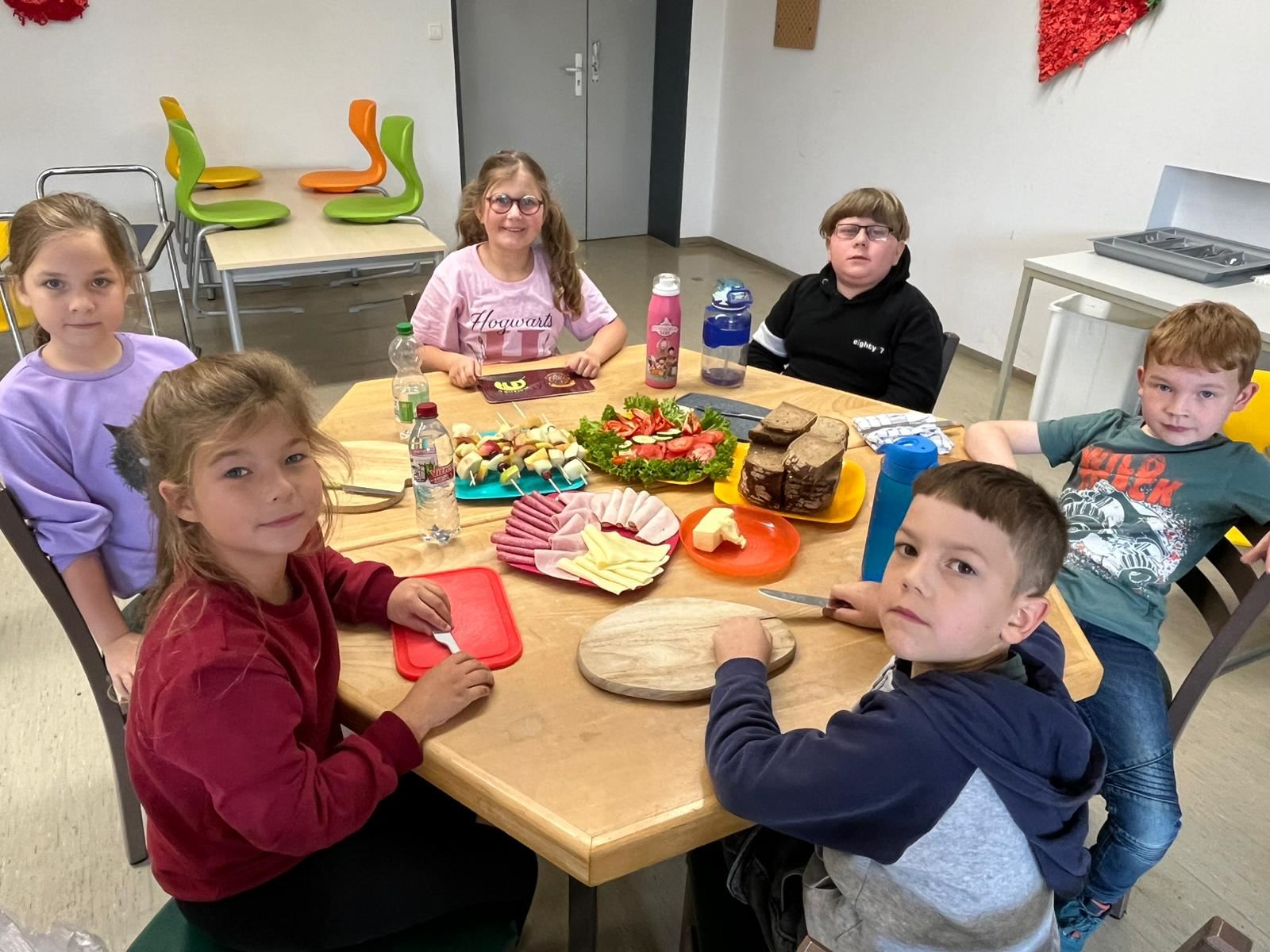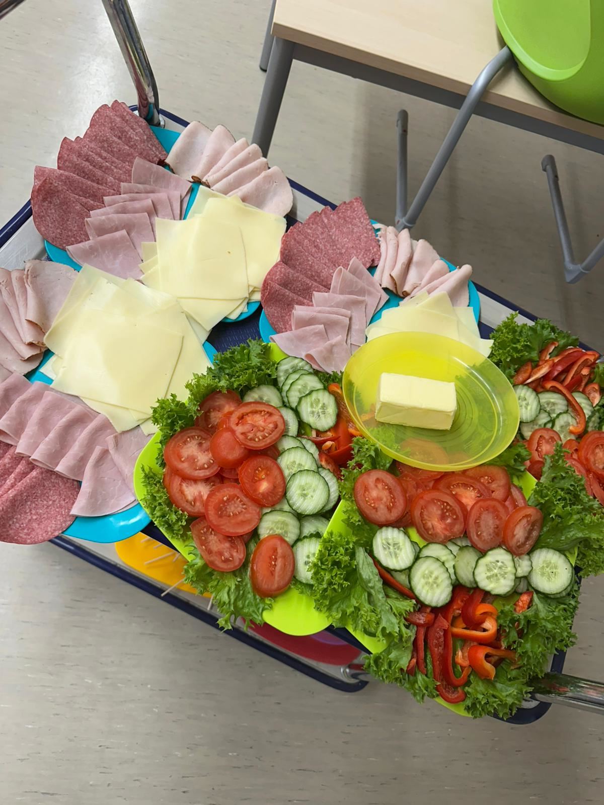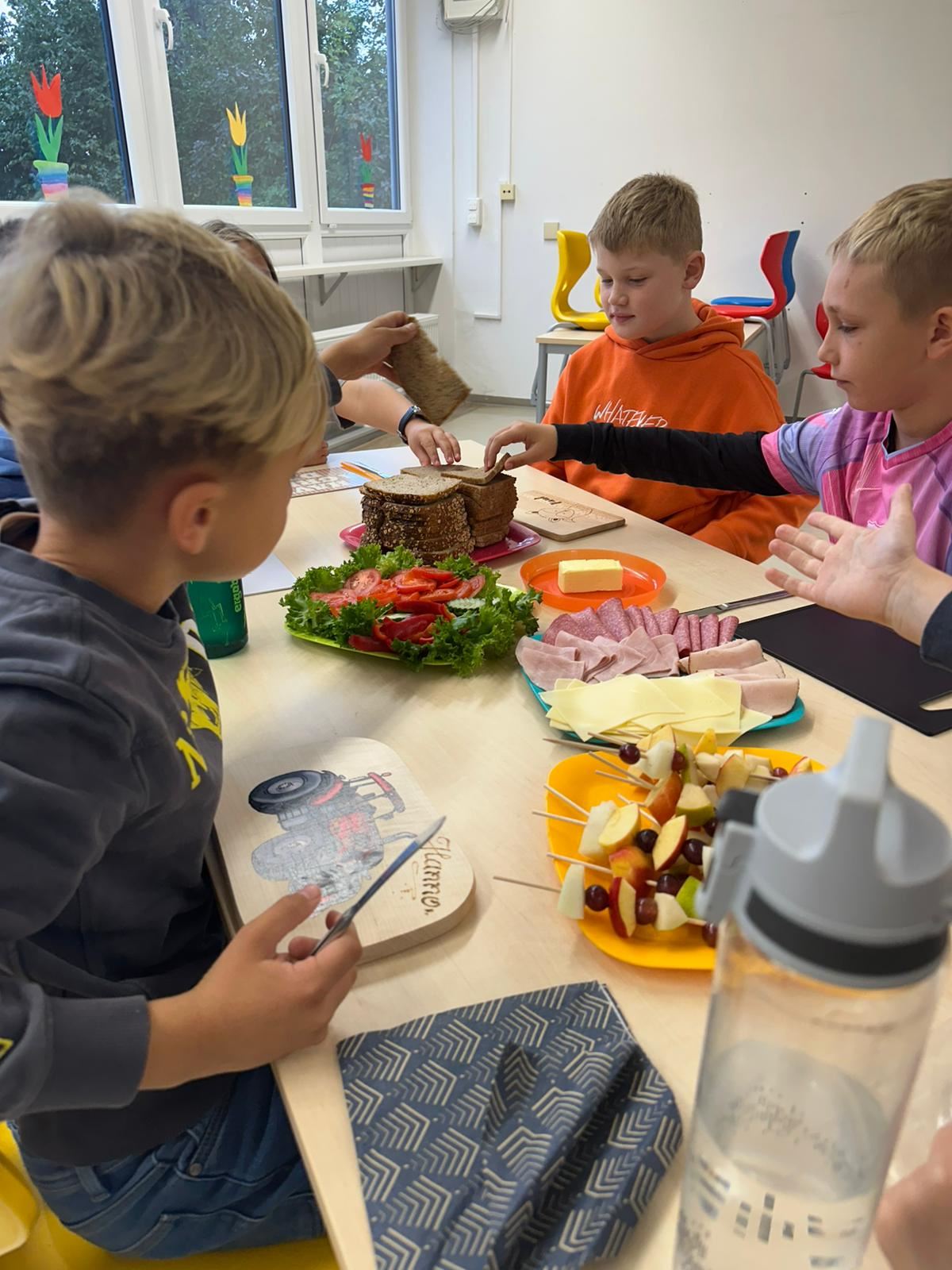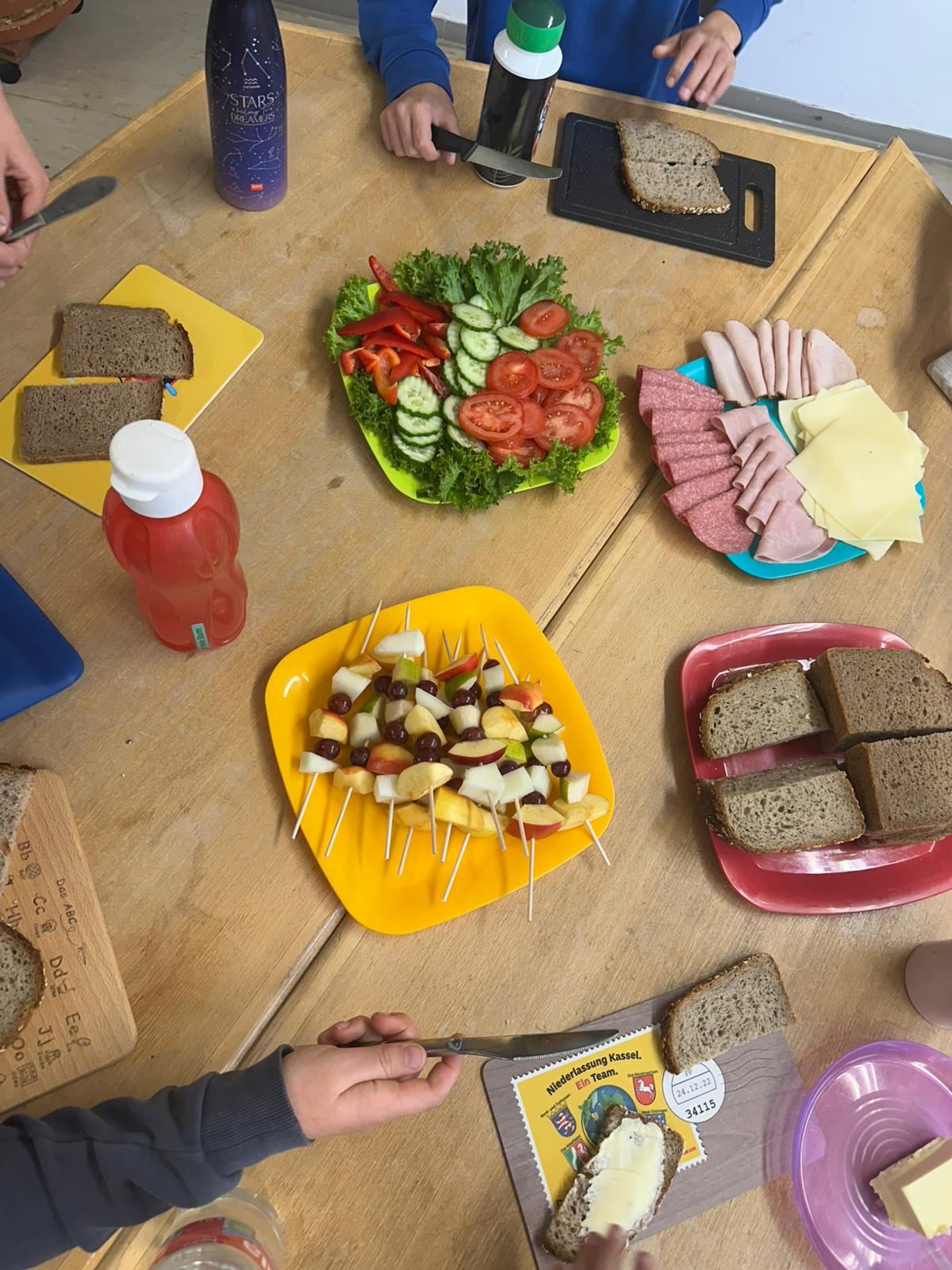 Anschließend wurde es praktisch: Die Kinder konnten sich ihre eigenen Brote belegen – mit Käse, Wurst und viel frischem Gemüse wie Paprika, Gurken und Tomaten. Dabei hatten alle viel Spaß und konnten gleichzeitig erleben, wie lecker ein gesundes Frühstück schmecken kann.