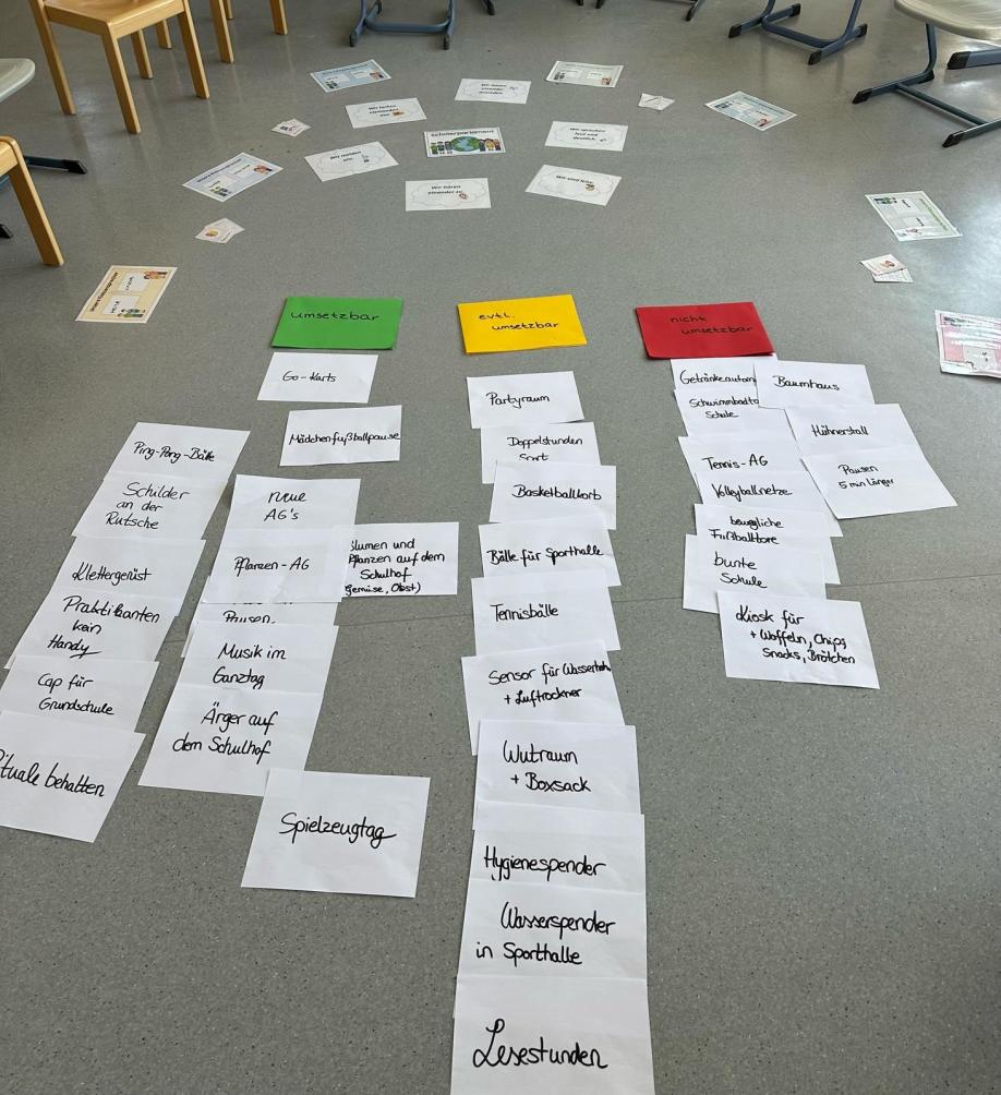 Um die Vielzahl an Ideen gemeinsam besser einordnen zu können, wurde ein Ampelsystem verwendet. Vorschläge, die sofort umsetzbar sind, wurden mit der Farbe Grün markiert. Ideen, die noch genauer geprüft oder weiterentwickelt werden müssen, erhielten die Farbe Gelb. Rote Markierungen bekamen solche Vorschläge, die aus bestimmten Gründen momentan nicht realisierbar sind. Dieses System half den Kindern, die Entscheidungsprozesse besser nachzuvollziehen und zu verstehen, welche Möglichkeiten bestehen und wo Grenzen liegen.