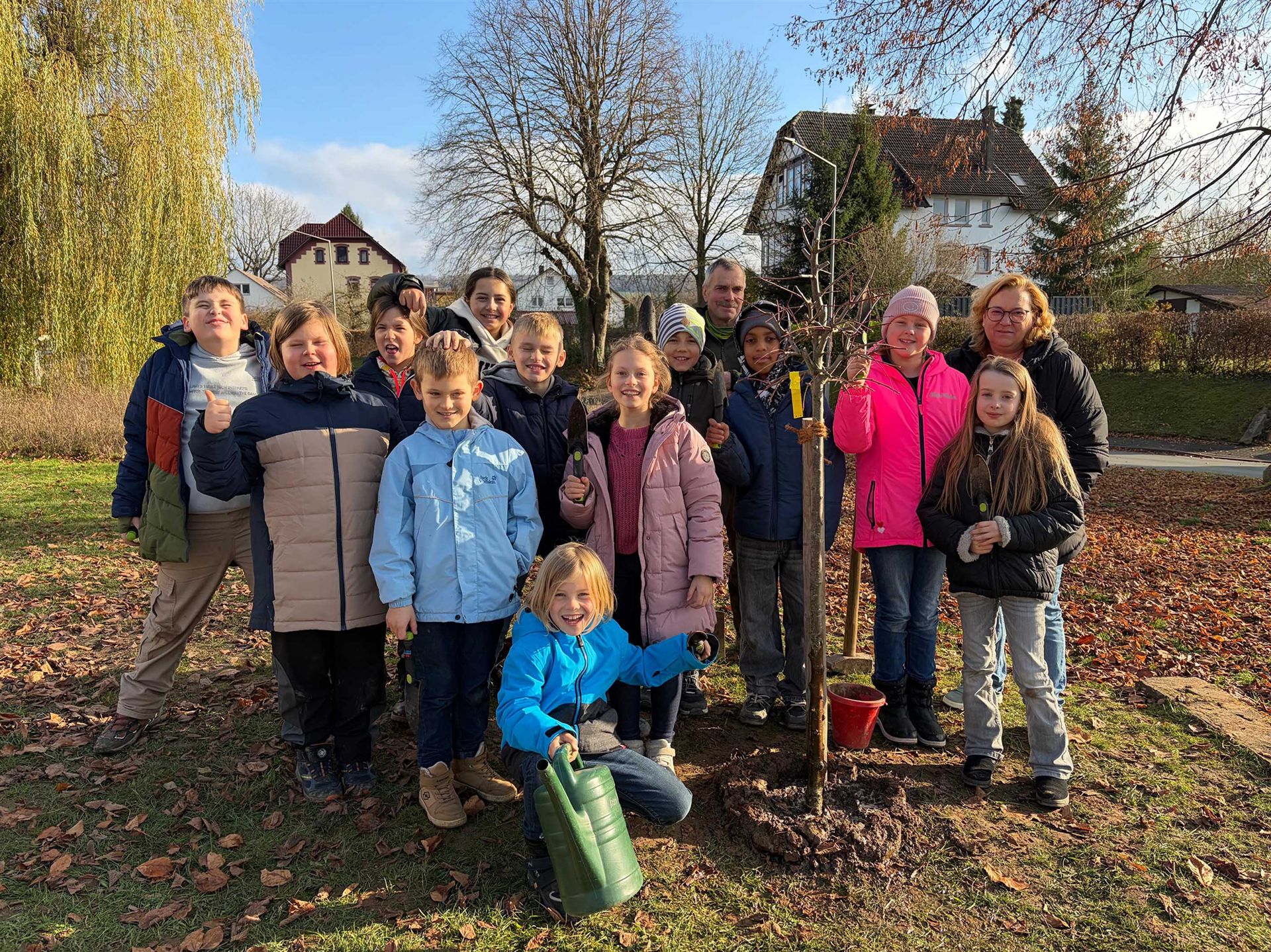 Die Schülerinnen und Schüler der 4a übernehmen ab sofort die Patenschaft für den jungen Baum. Sie werden ihn regelmäßig gießen und darauf achten, dass er genügend Wasser bekommt, um kräftige Wurzeln zu bilden.