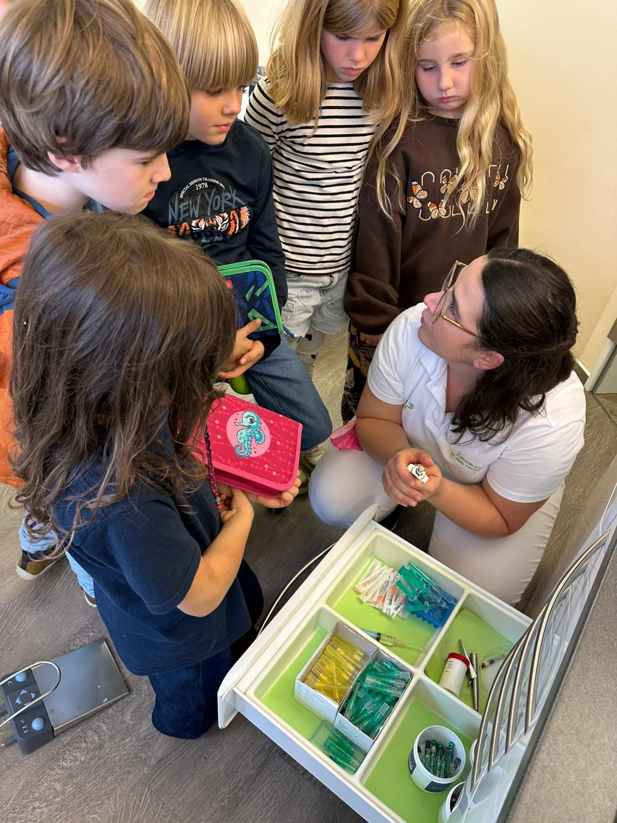 Mit viel Vorfreude und Neugier – und natürlich einigen spannenden Fragen im Gepäck – machten sich die Klasse schließlich auf den Weg zur Praxis. Vor Ort erklärte das Team von „Zahn Hoch 3“, wie und warum ein Zahn versiegelt wird und zeigte anschaulich, wie die Versiegelung funktioniert. An einem großen Gebissmodell wurde außerdem noch einmal die KAI-Methode zum Zähneputzen demonstriert.